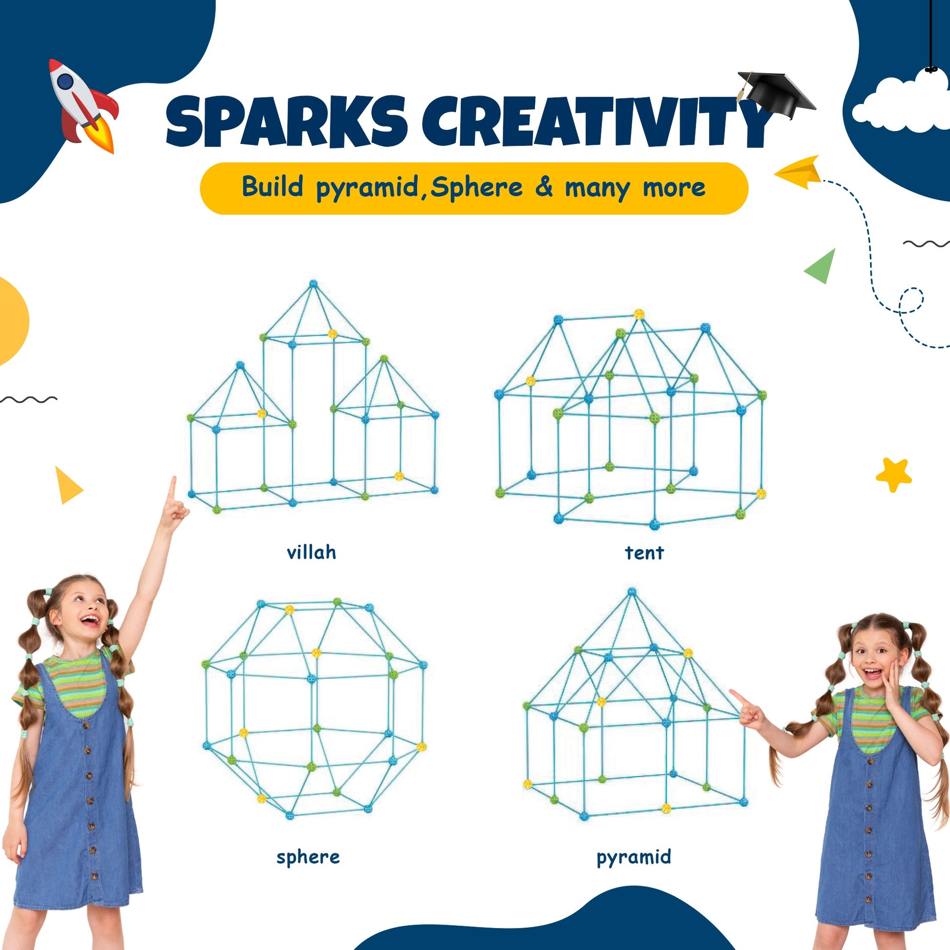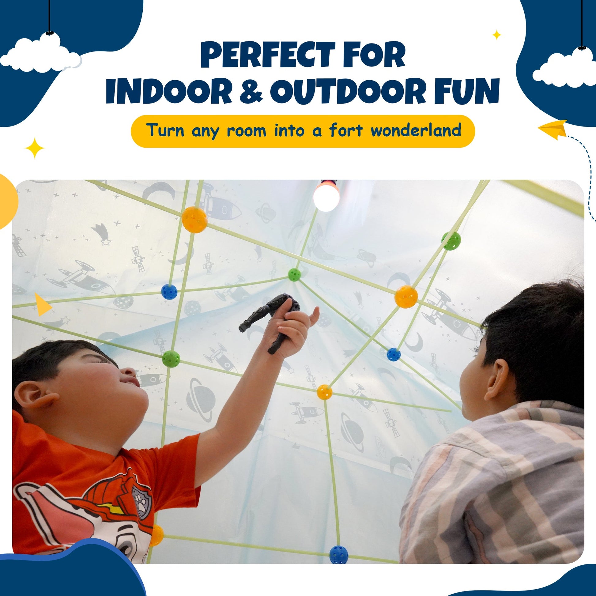 Create Magical Forts Anywhere – Includes 88 sturdy sticks, 44 connecting balls, and a starry sky sheet for building cozy tents, castles, rockets, and more—perfect for indoor playrooms or sleepovers.